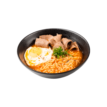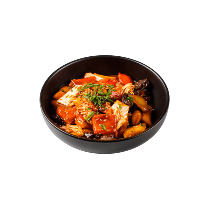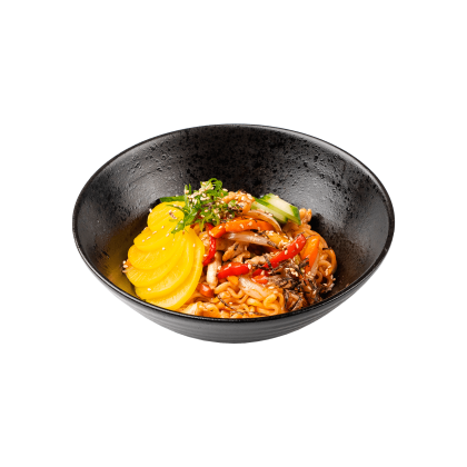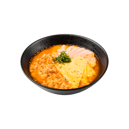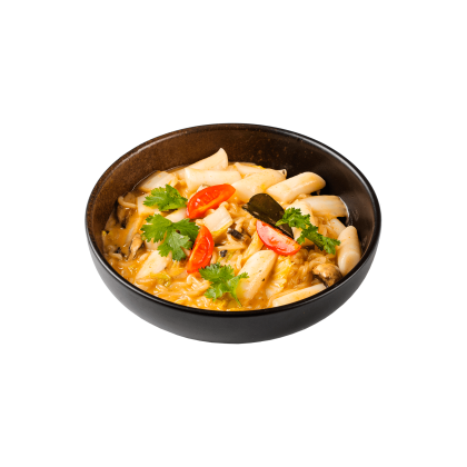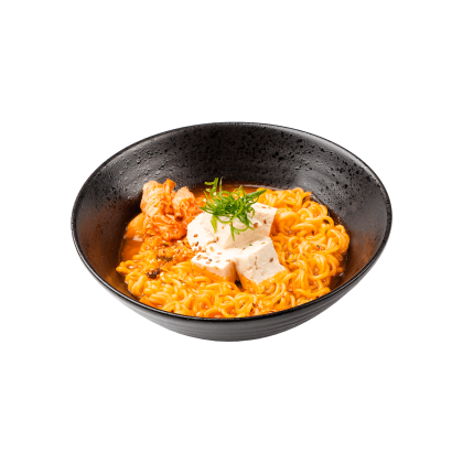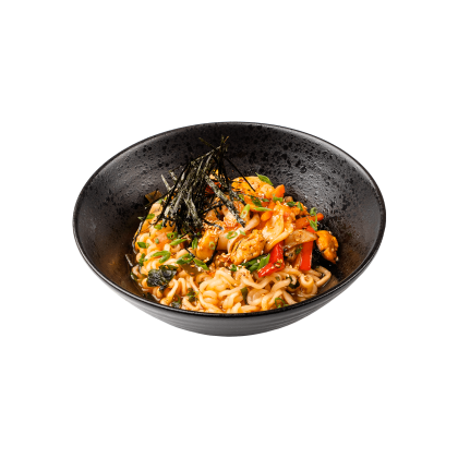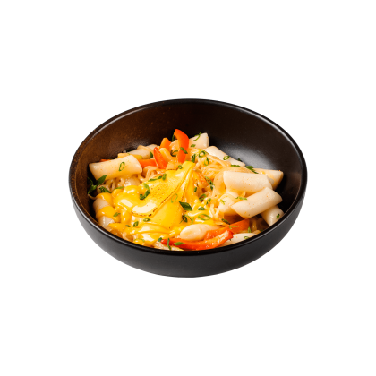 Корейская лапша быстрого приготовления, токпокки, сливки, бекон, соевый соус.