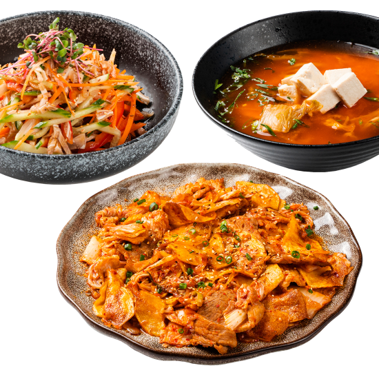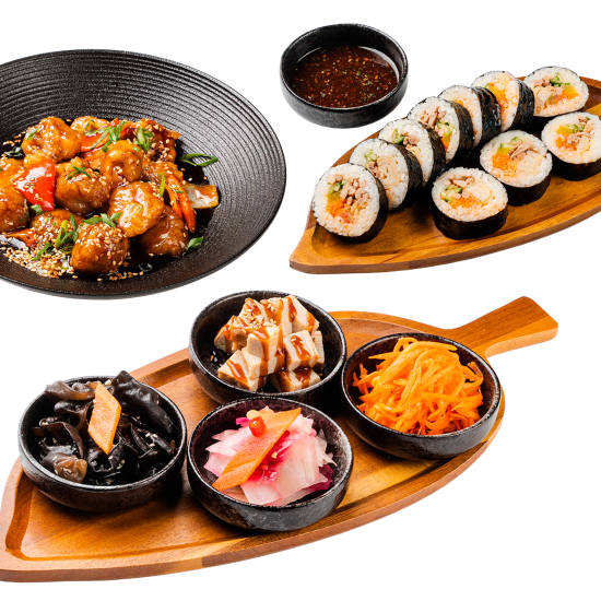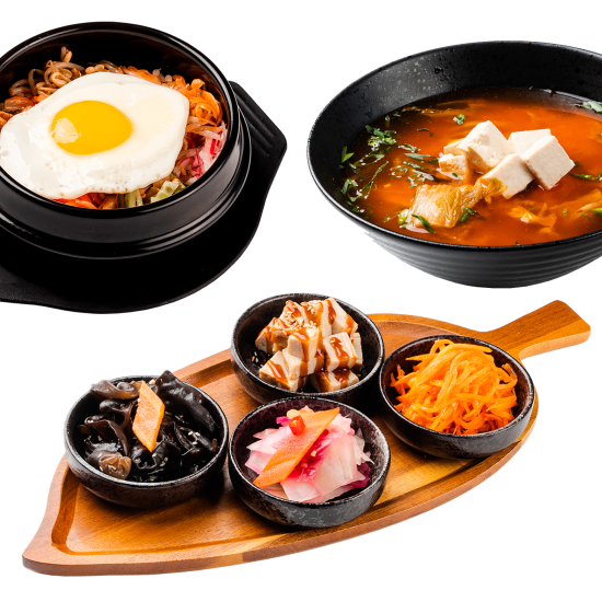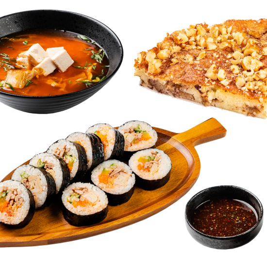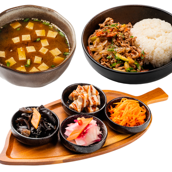 Пибимпаб с курицей- паровой рис с овощами, курицей и фирменным соусом. Салат Китайский “Домашний” - хрустящие овощи и лёгкая заправка в классическом вкусе -200 гр. Мисо-суп - традиционный легкий японский суп 300 мл.