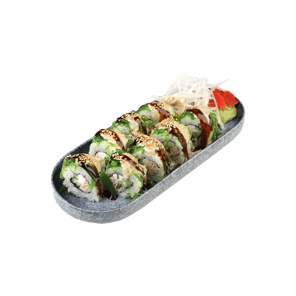 Ролл с крабом, творожным сыром, чукка, соусом спайси и ореховым соусом
