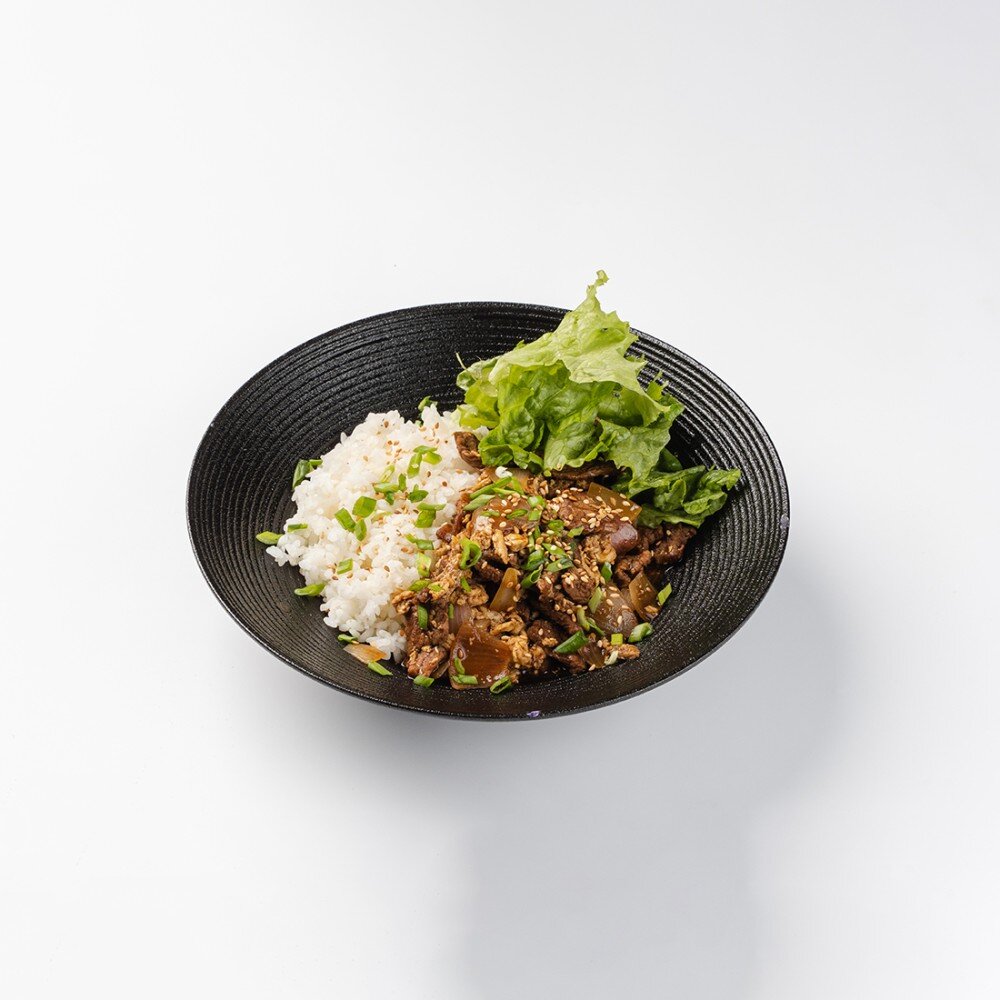 牛肉炒饭 Говядина, красный лук, рис на пару, яйцо куриное, лист салата, зеленый лук, соус.