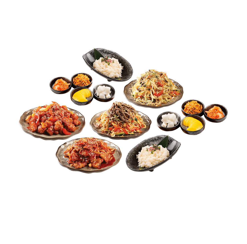 Губажоу XL, салат домашний XL, салат китайский с фунчозой и говядиной XL мясо с ананасами XL, Рис на пару, панчан сет традиционный