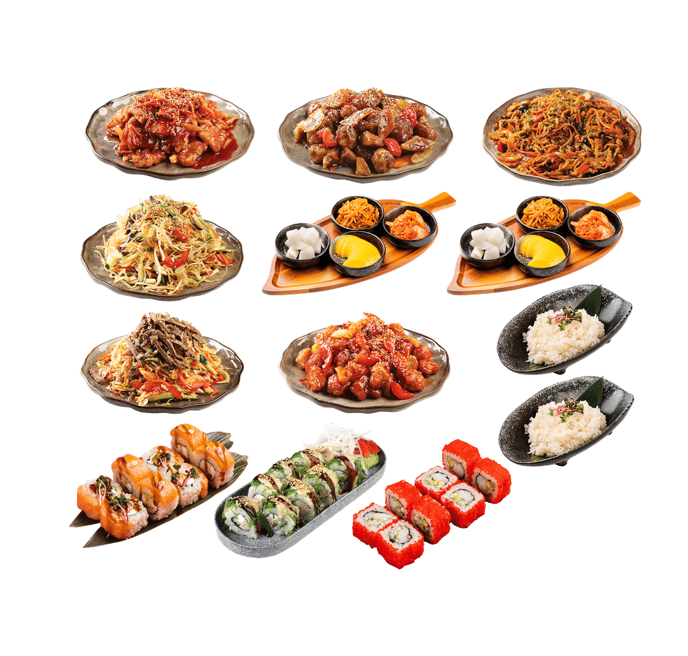 Баклажаны по-китайски XL, губажоу XL, свинина веревочка XL, салат домашний XL, салат китайский с фунчозой и говядиной XL, мясо с ананасами XL, сяке рору, калифрния с керветкой, ролл острый краб Вакаммэ