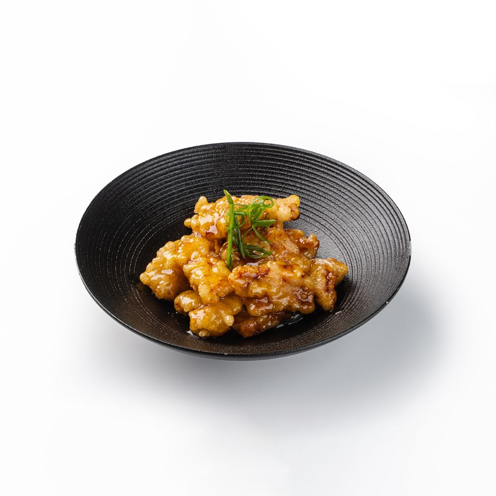 橙汁锅包肉(猪肉) Мясо, приготовленная в кляре, обжаренная в апельсиновом соусе с луком и морковью.