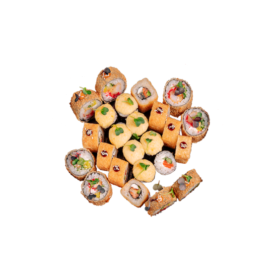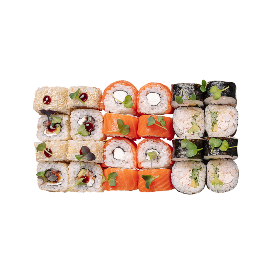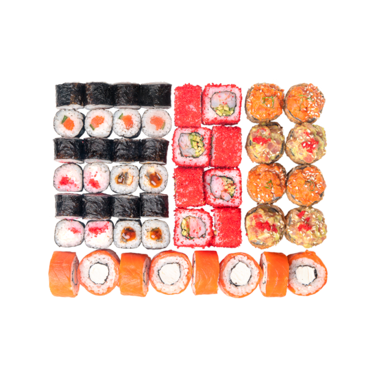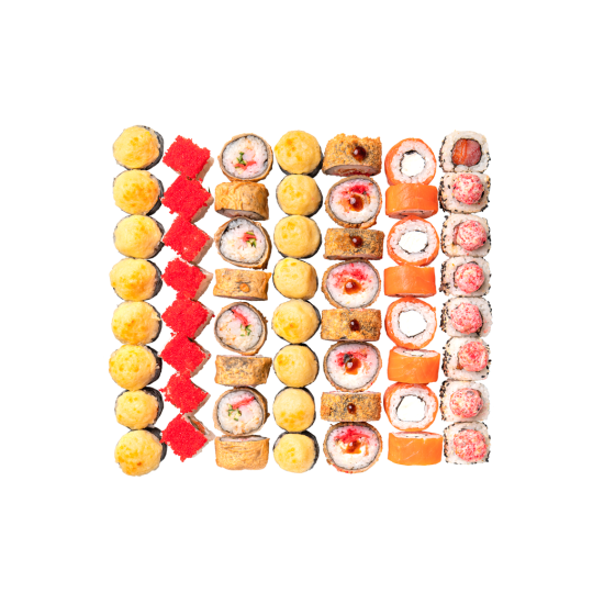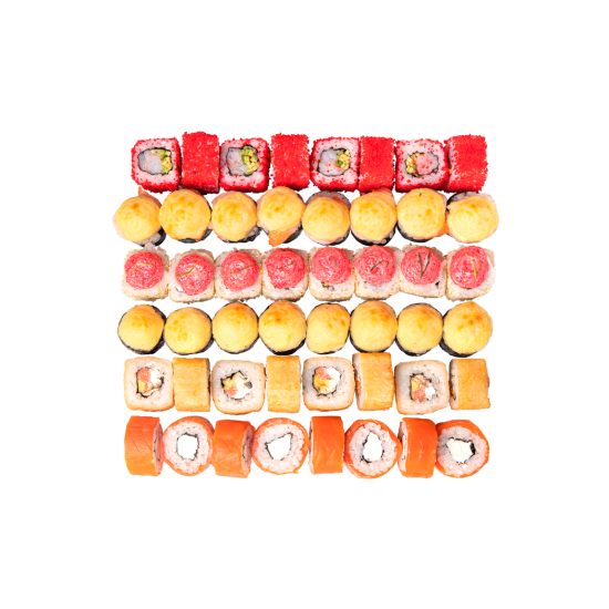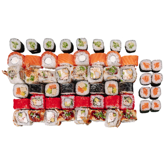 Филадельфия, Лава маки, Сяке унаги маки, Евразия, Калифорния с креветкой, Хосомаки с угрем, Хосомаки с лососем, Тобико хосомаки, Американо маки, Темпура маки.(80кусочков).