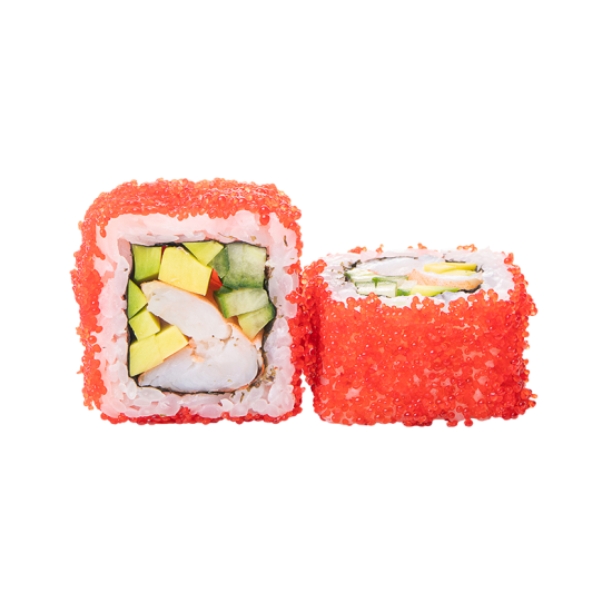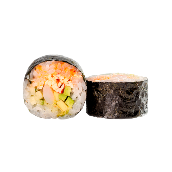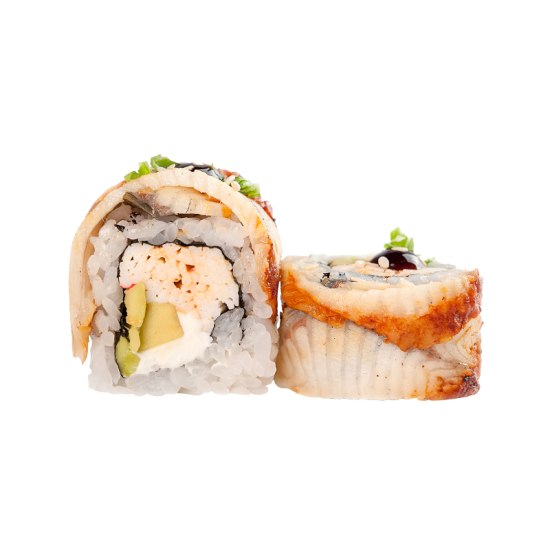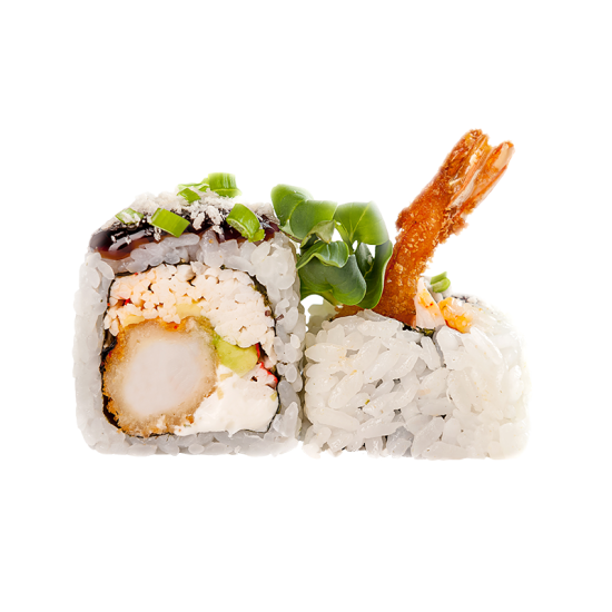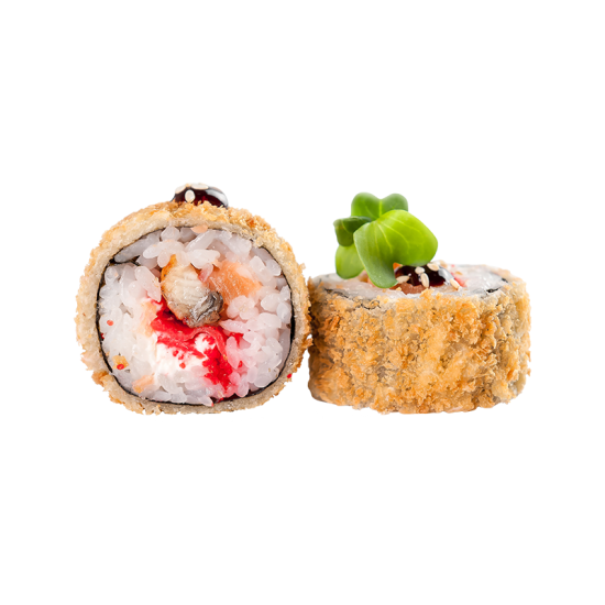Креветка, огурец, такуан, унаги, кунжут, творожный сыр, тобико, панировка.
